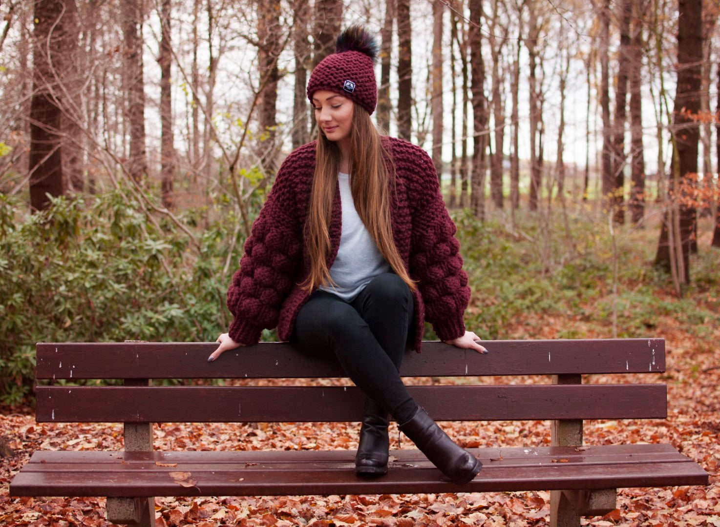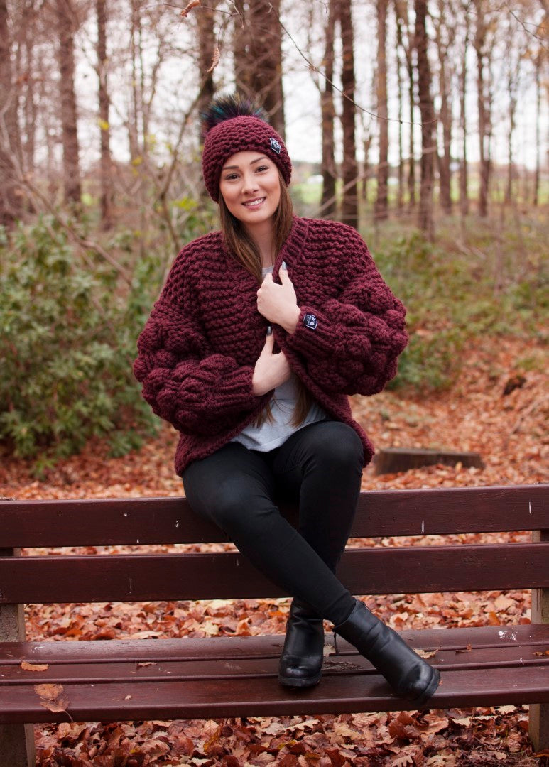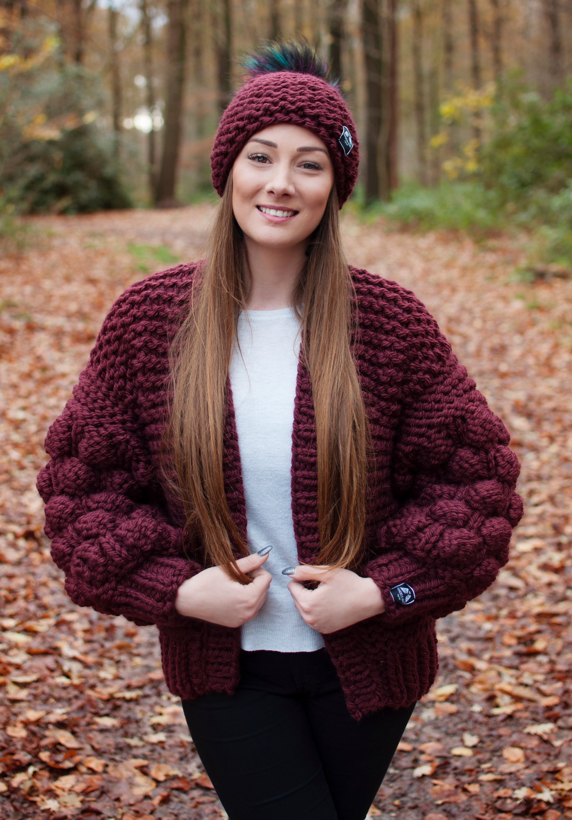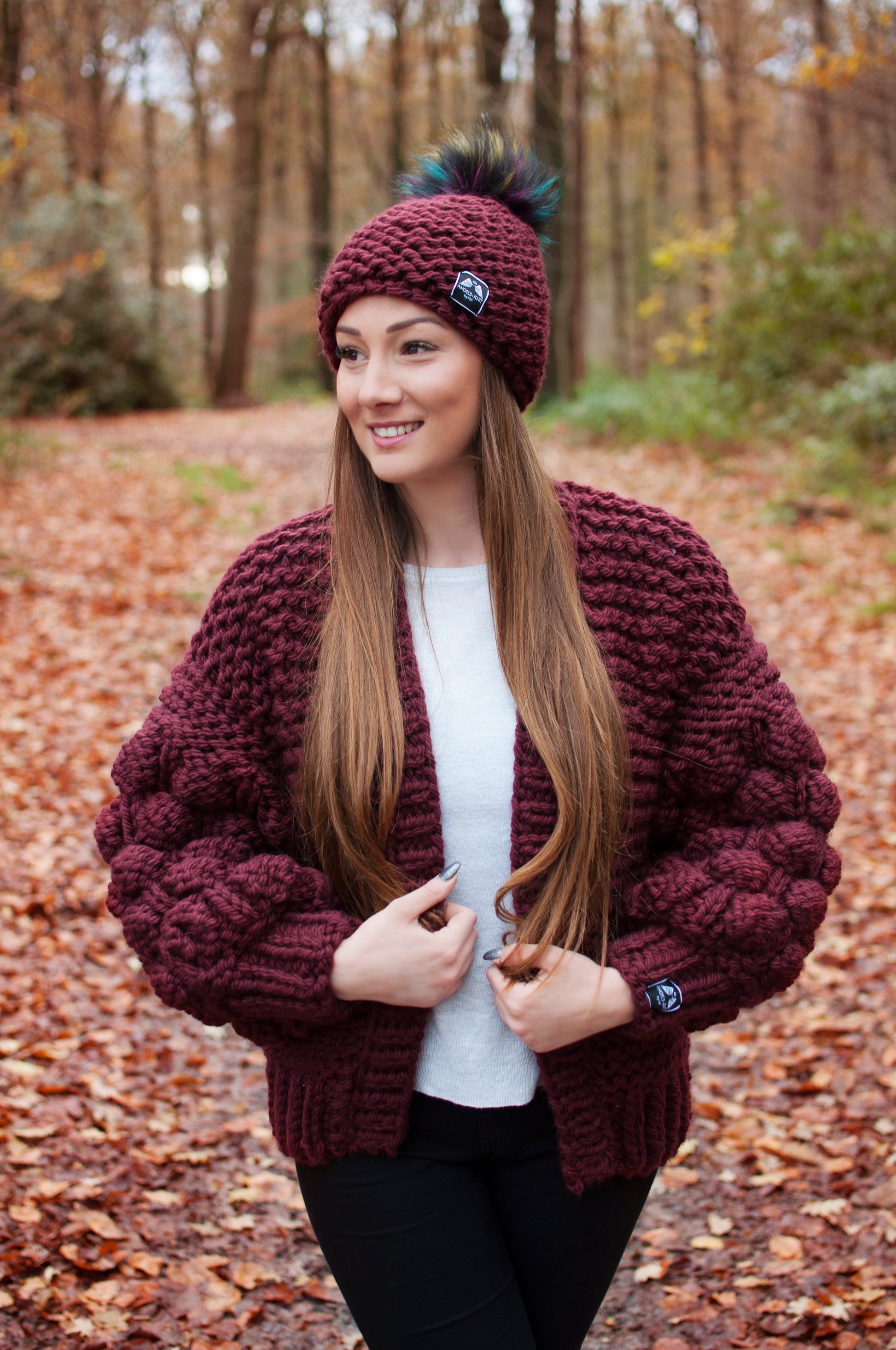 Deze handgebreide cardigan is een variatie op het geliefde model Marie. Het combineert een grof breisel met stijlvolle ballonmouwen, afgewerkt met een uniek bollenmotief voor een speelse en modieuze uitstraling.