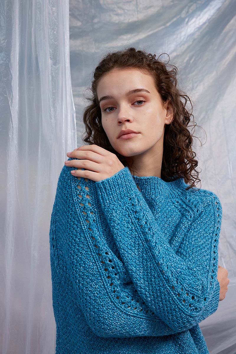 De trui is gebreid in rijstpatroon, met lange mouwen waarin een subtiel gaatjespatroon in het midden verwerkt is. De ronde hals en de raglanmouwen met opvallende minderingen geven het model een verfijnde, eigentijdse uitstraling.