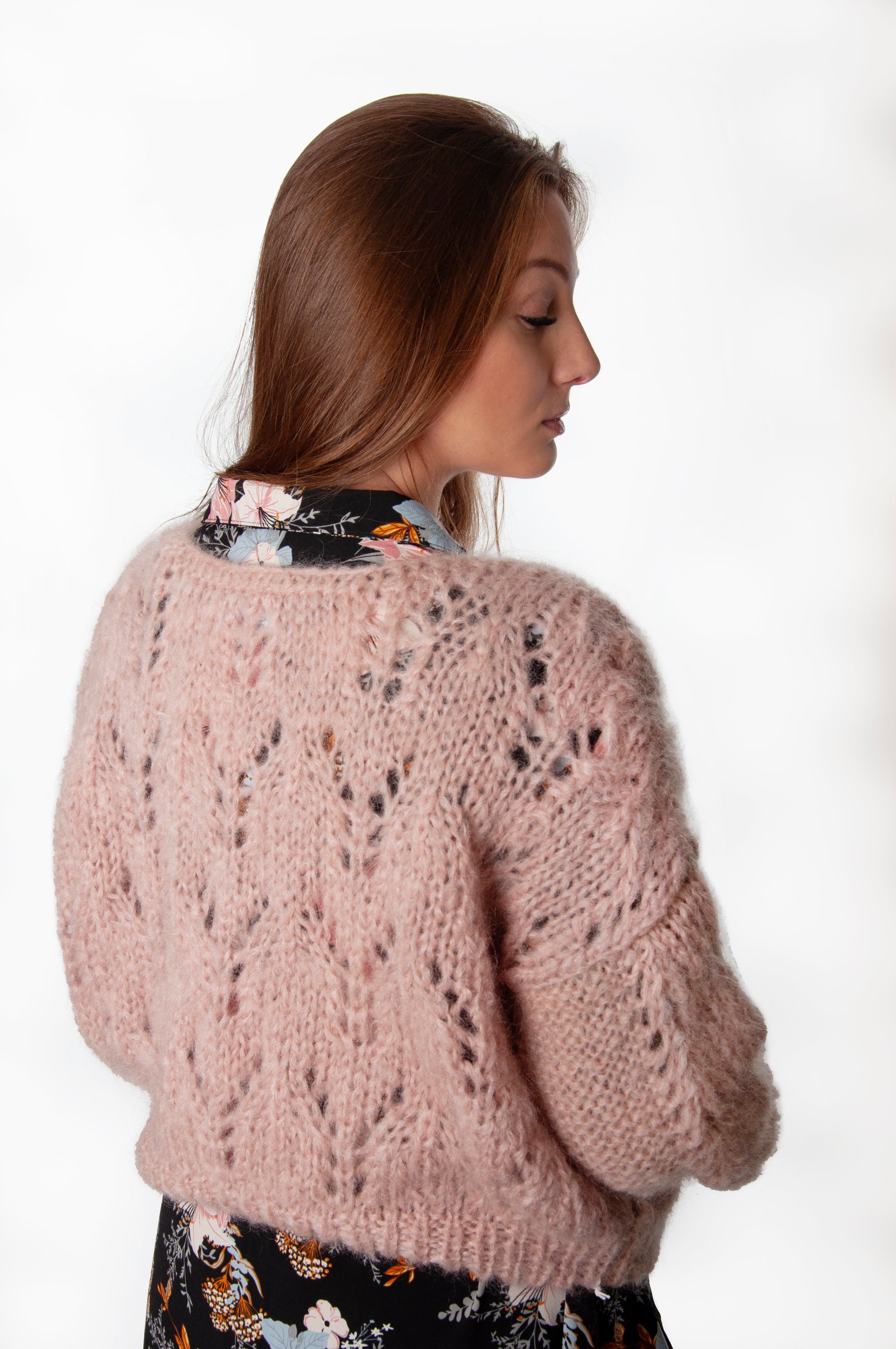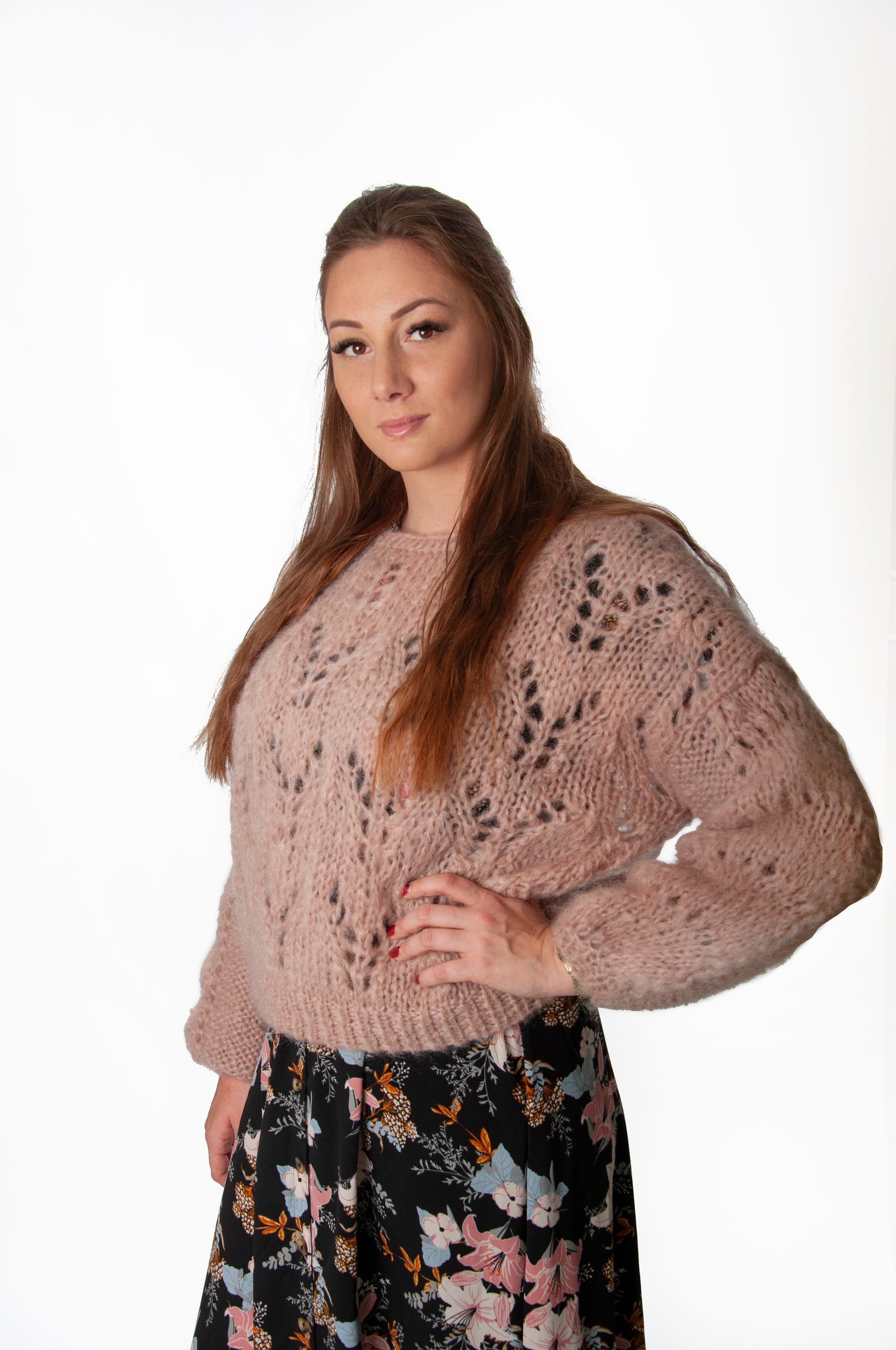 Upgrade je wintergarderobe met deze prachtige handgebreide trui. Het subtiele ajourpatroon op zowel het voorpand als achterpand en de mouwen geeft de trui een elegante en vrouwelijke touch. Gemaakt van een zachte mix van mohair en wol, voelt hij heerlijk warm en luxueus aan, terwijl de oversized pasvorm zorgt voor een relaxte, moderne look. Korte versie van de Fanny.