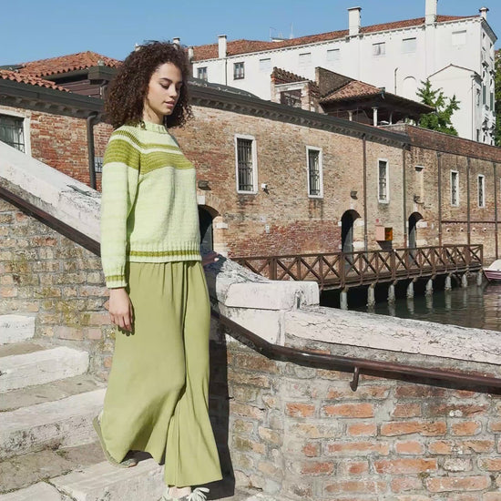Trui DELIGHT is een zomerse, handgebreide trui met een frisse en moderne uitstraling. Gebreid in de kwaliteit GLOW van Wooladdicts by Langyarns vangt het garen bij elke steek het licht, dankzij de subtiele glans van lyocell. Het model heeft een comfortabele, licht losvallende pasvorm met ronde hals, lange mouwen en een brede boord. De horizontale strepen geven de trui een speels en zonnig karakter, perfect te combineren voor een casual maar stijlvolle look.