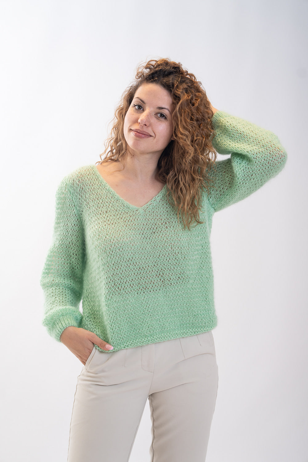 Deze handgebreide trui is een waar kunstwerk van zachtheid en elegantie. Gemaakt met de luxueuze garens Noelle en Mohair Luxe, voelt ze aan alsof je niets draagt – behalve een omhelzing van merino, mohair en zijde. De openweefstructuur zorgt voor een luchtig, speels effect, terwijl de subtiele glans van zijde de trui net dat tikkeltje extra geeft.
