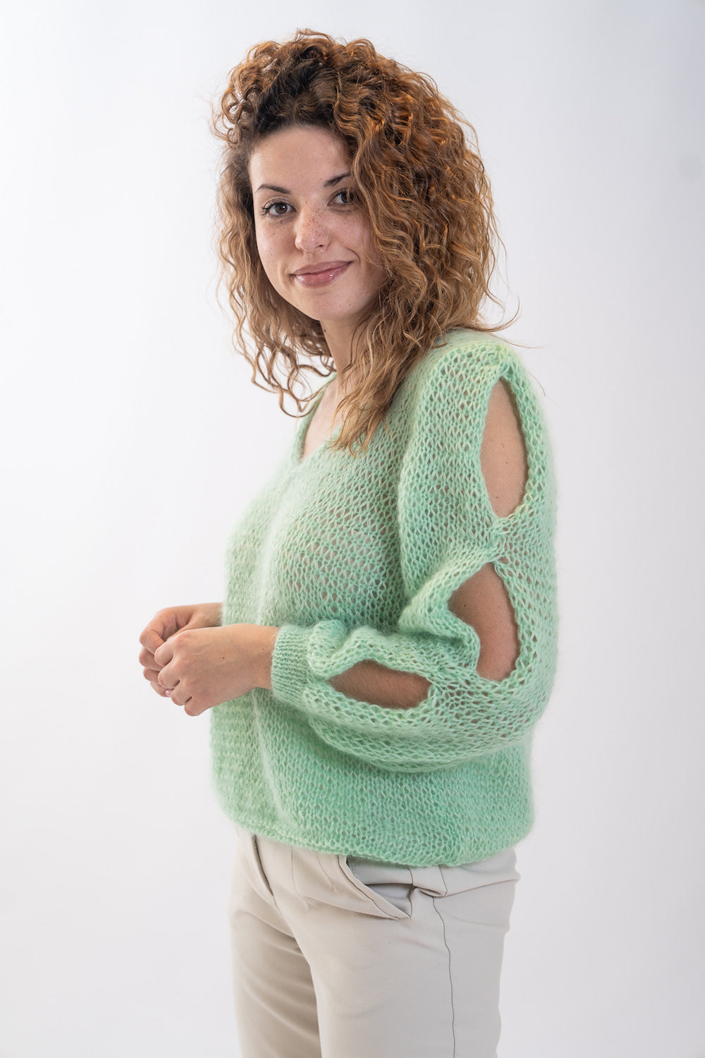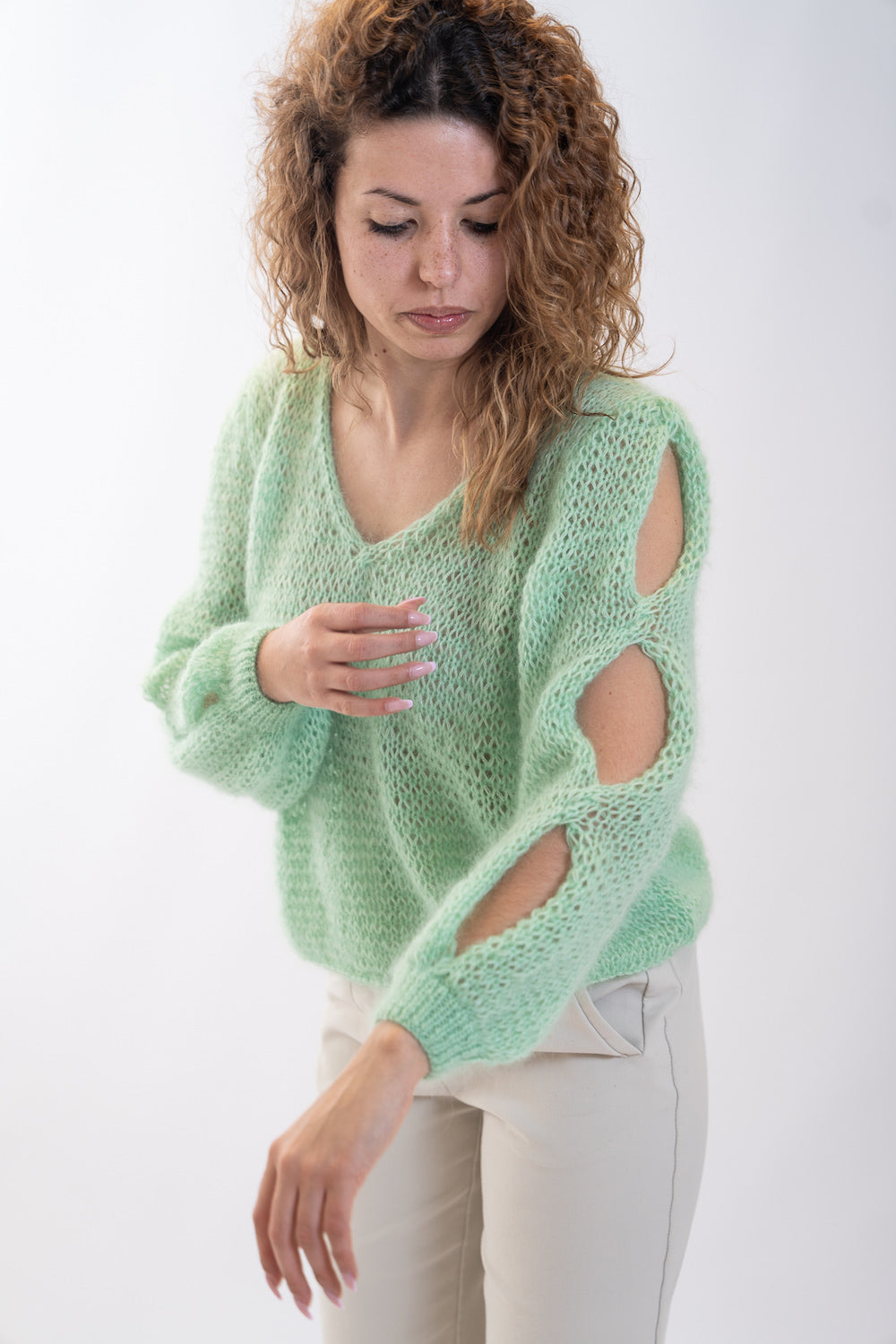 De diepe V-hals benadrukt de vrouwelijke lijn, en de drie openingen op de mouwen maken van deze trui een echte blikvanger. Elk stuk wordt met de hand gebreid, waardoor het niet alleen een kledingstuk is, maar ook een uniek verhaal van vakmanschap en stijl. Draag haar op een casual jeans of combineer met een elegante rok – deze trui tilt elke outfit moeiteloos naar een hoger niveau.